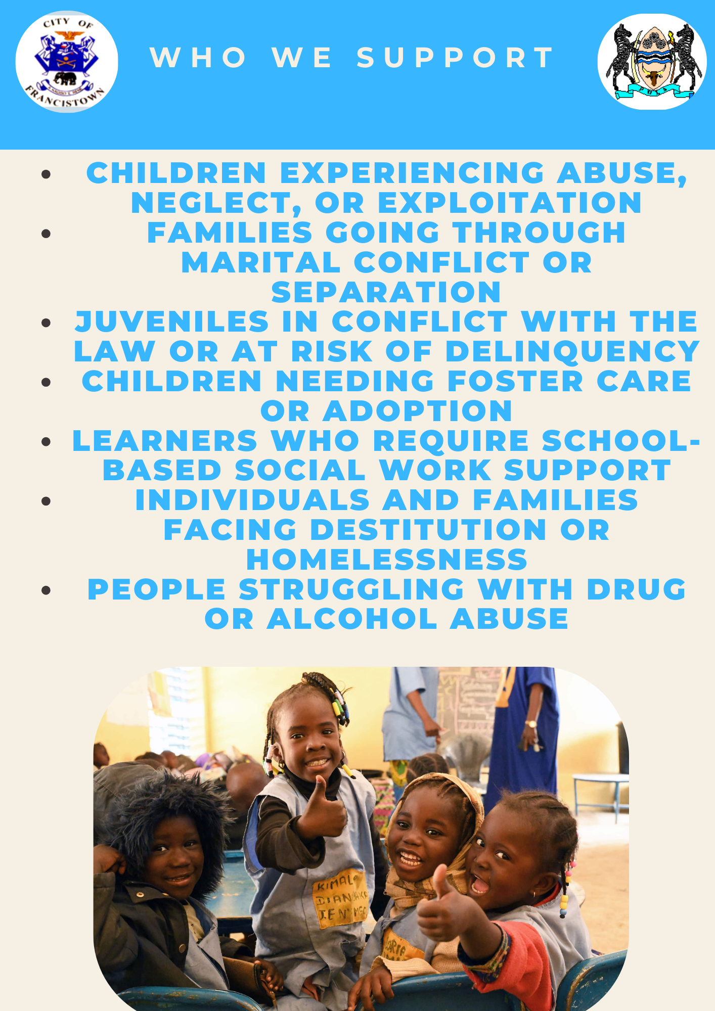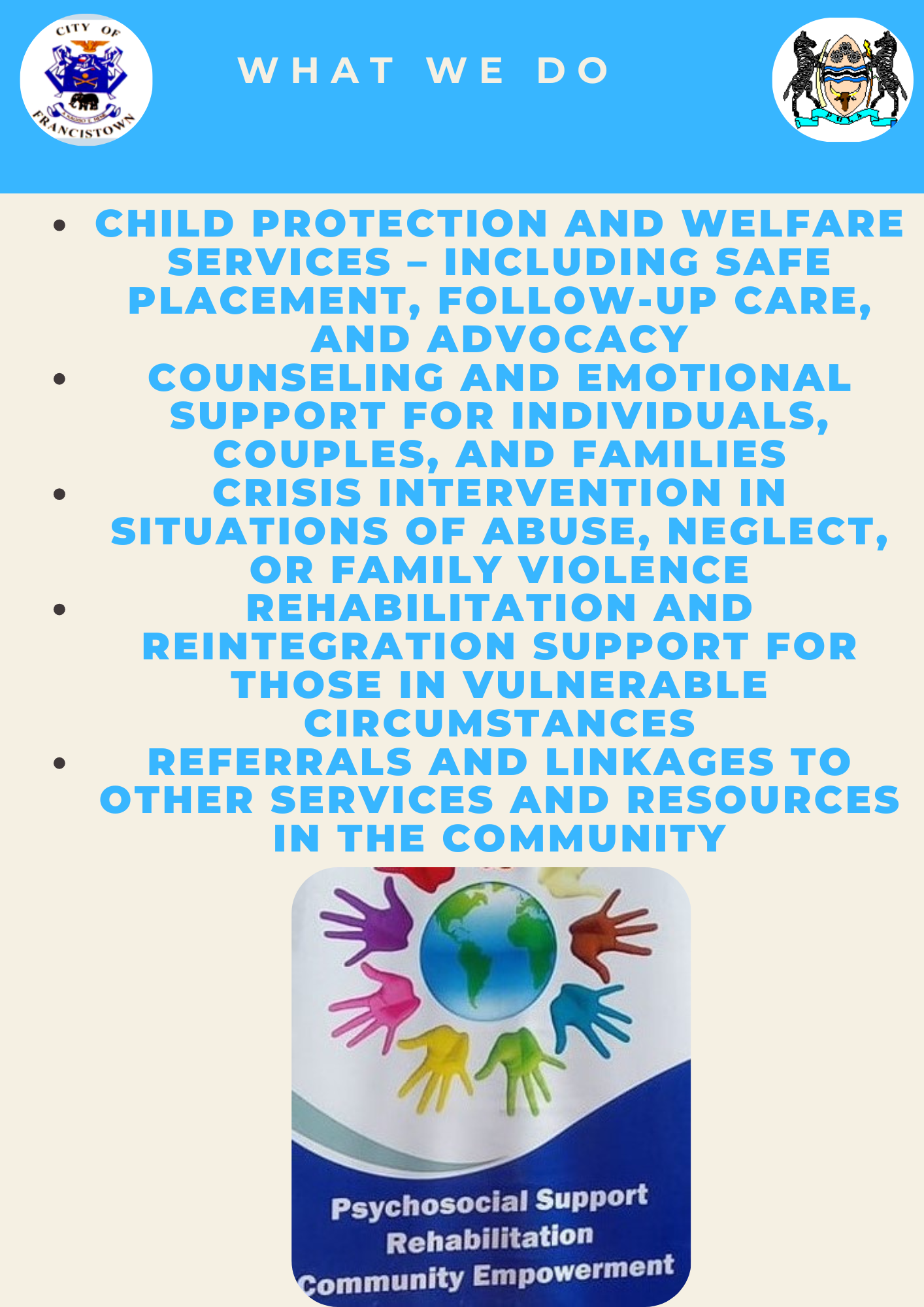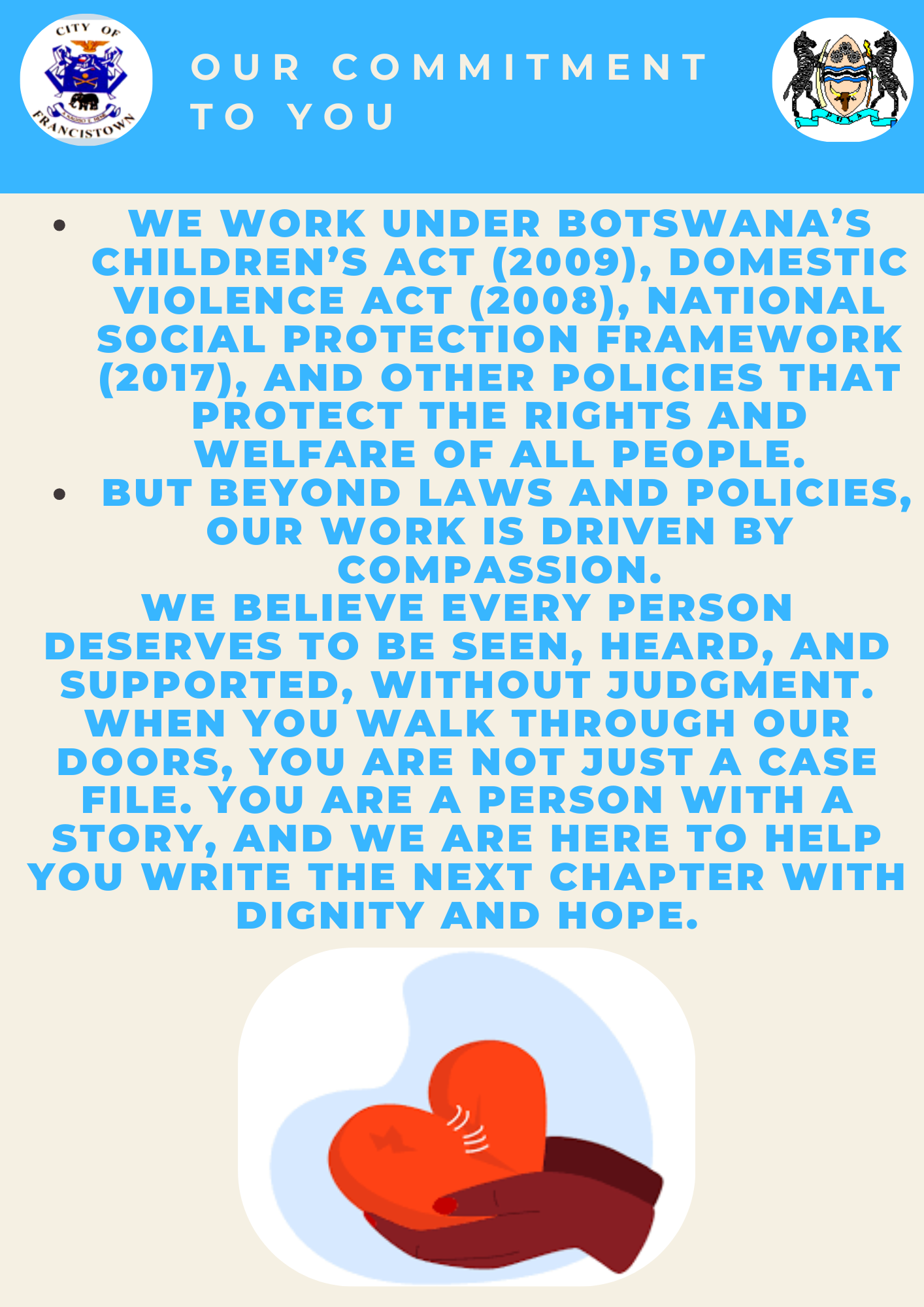 Our goal is to protect the vulnerable, strengthen families, and help every individual in Francistown live with dignity, safety, and hope